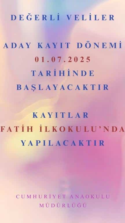 ADAY KAYIT DÖNEMİ 01.07.2025 TARİHİNDE BAŞLAYACAKTIR. KAYIT İÇİN FATİH İLKOKILU'NA BAŞVURULMASI GEREKMEKTEDİR.
